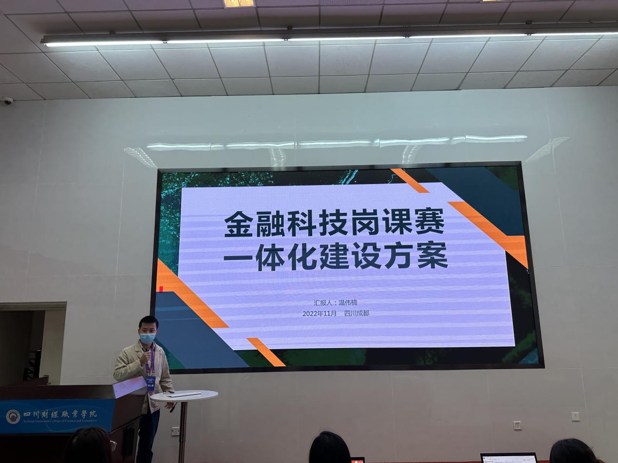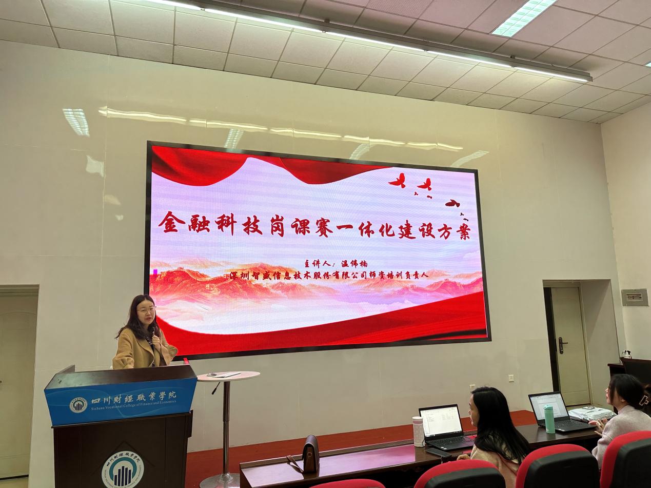 第一位深圳智盛信息技术股份有限公司师资培训负责人温伟楠老师分享主题为“金融科技应用教学训创一体化建设方案”的讲座。温伟楠老师从银行业务综合技能赛项的发展历程和金融科技应用教学训创一体化建设思路两个方面分享了相关内容。温老师剖析了银行业务综合化技能大赛的赛项内容和设计,根据金融科技政策背景介绍了金融科技应用教学训创一体化建设思路。