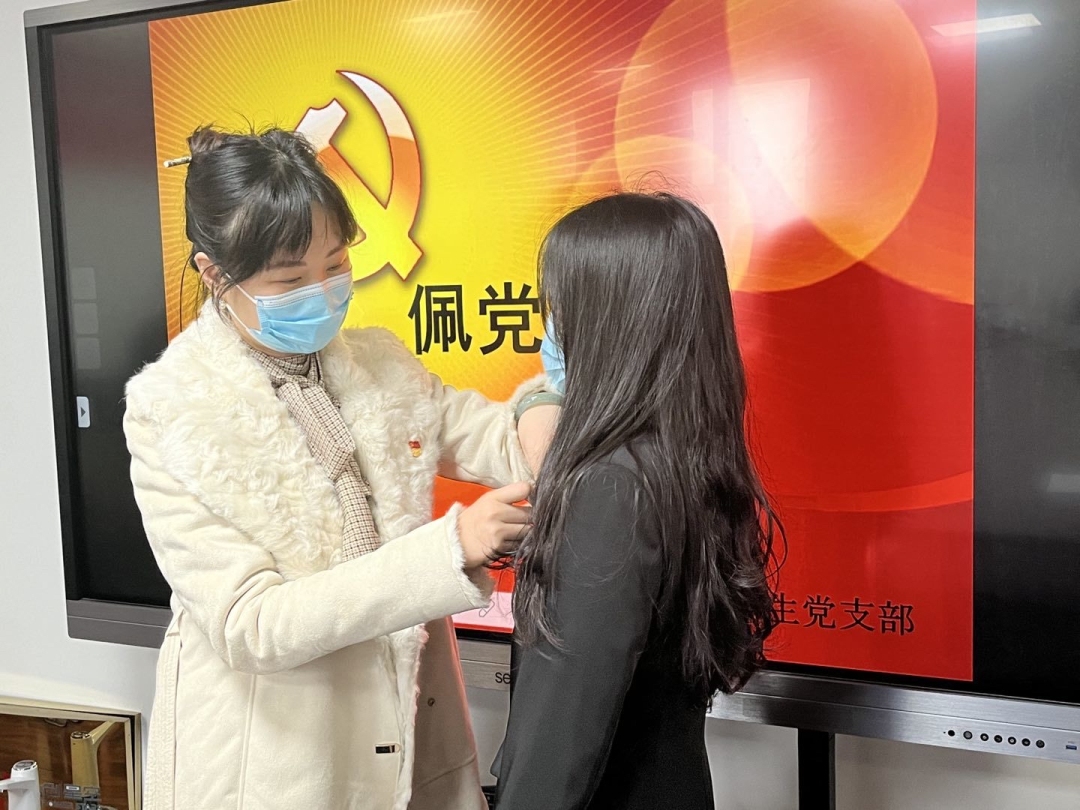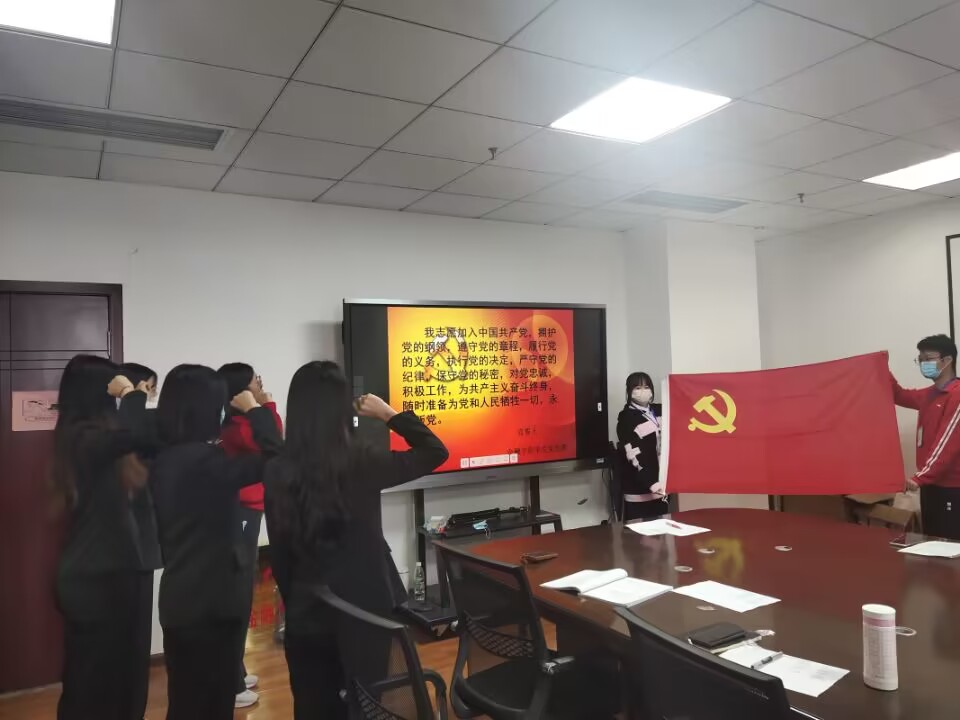 会议由陈世千老师主持,严格按照党员发展流程进行。会上,郑鑫等四名同学从成为入党积极分子、发展对象以来在思想、学习、工作等情况作了总结汇报,同时,四名同学也都一一做了表决,要用党员的标准严格要求自己的一言一行,在学生中带好头,做好榜样,不辜负老师和同学的信任。随后,相关党员联系老师给出了意见和建议,并进行投票表决。四名同学在党旗前进行入党宣誓,党员老师为他们佩戴党徽,整个过程严肃认真,流程规范,最后支部大会形成决议报上级党委审批。