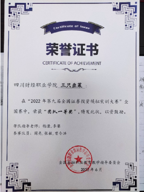 11.11月18日,财富管理教研室老师杨滢、金融科技应用老师李馨组织学生参加2022年第九届全国证券投资模拟实训大赛荣获团体一等奖,并受邀参加全国证券投资模拟实训大赛冠军邀请赛,获银奖。让学生发挥学科背景优势,将理论和实践相结合,提升自身的实操能力和专业素养,推进了专业建设和实践教学改革。