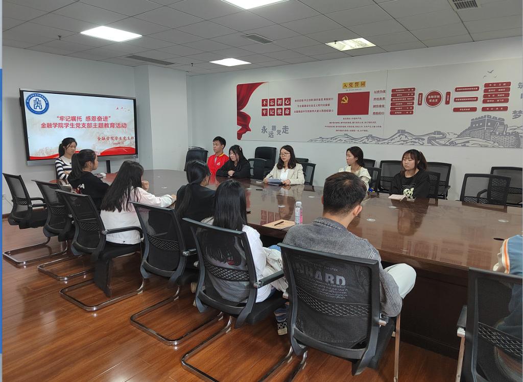 为深入学习贯彻习近平新时代中国特色社会主题思想,落实“学思想、强党性、重实践、建新功”总要求,强化学生爱国主义和感恩教育。5月10日,金融学院学生党支部在明德楼712开展“牢记嘱托 感恩奋进”主题教育活动,会议由金融学院学生党支部副书记蒲晓玲同志主持,大一主要学生干部参与。