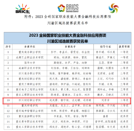 2023年9月14日,2023金砖国家职业技能大赛金融科技应用赛项区域选拔赛在重庆商务职业学院拉开帷幕。最终由我院四名学生赵茂霖、冯雨婷、郭宇杭、谈光耀组成的队伍获得了金融科技应用赛项川渝赛区三等奖。