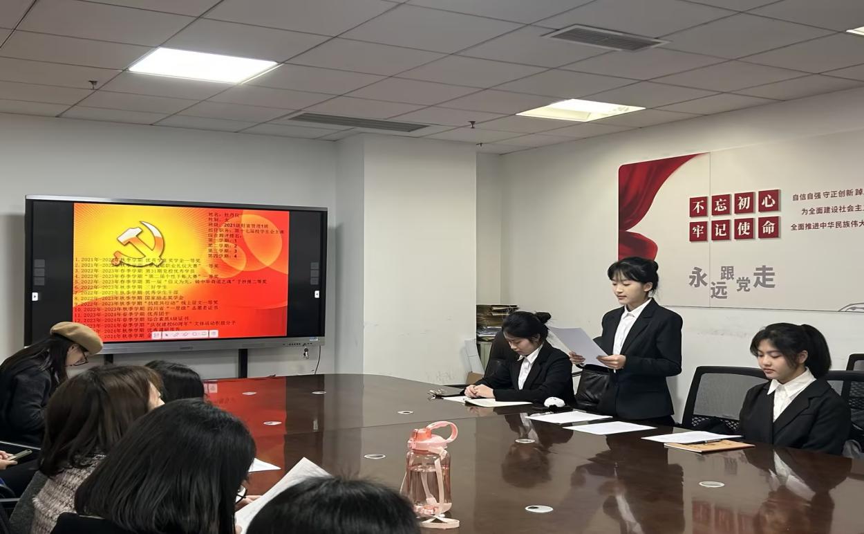 学生党支部书记蒲晓玲主持此次会议,会议开始,蒲老师为拟定发展为预备党员的三位同志阐述入党基本要求和程序。杜丹仪等三位同志分别向党组织进行思想汇报,阐述近一年的思想、学习、工作表现,并表明自身对中国共产党的衷心与热爱,表示自我加入共产党的决心,不忘初心,牢记使命,在以后将不断提高自己的思想觉悟,进一步向党组织靠拢。各党员培养联系老师对三位同志的表现进行说明,表扬优点,指出不足,对三位同志提出了新的期望与要求。党支部党员老师对是否同意杜丹仪等三位同志吸收为预备党员进行逐一投票表决,三名同志均通过投票表决。