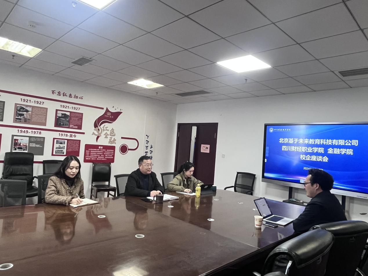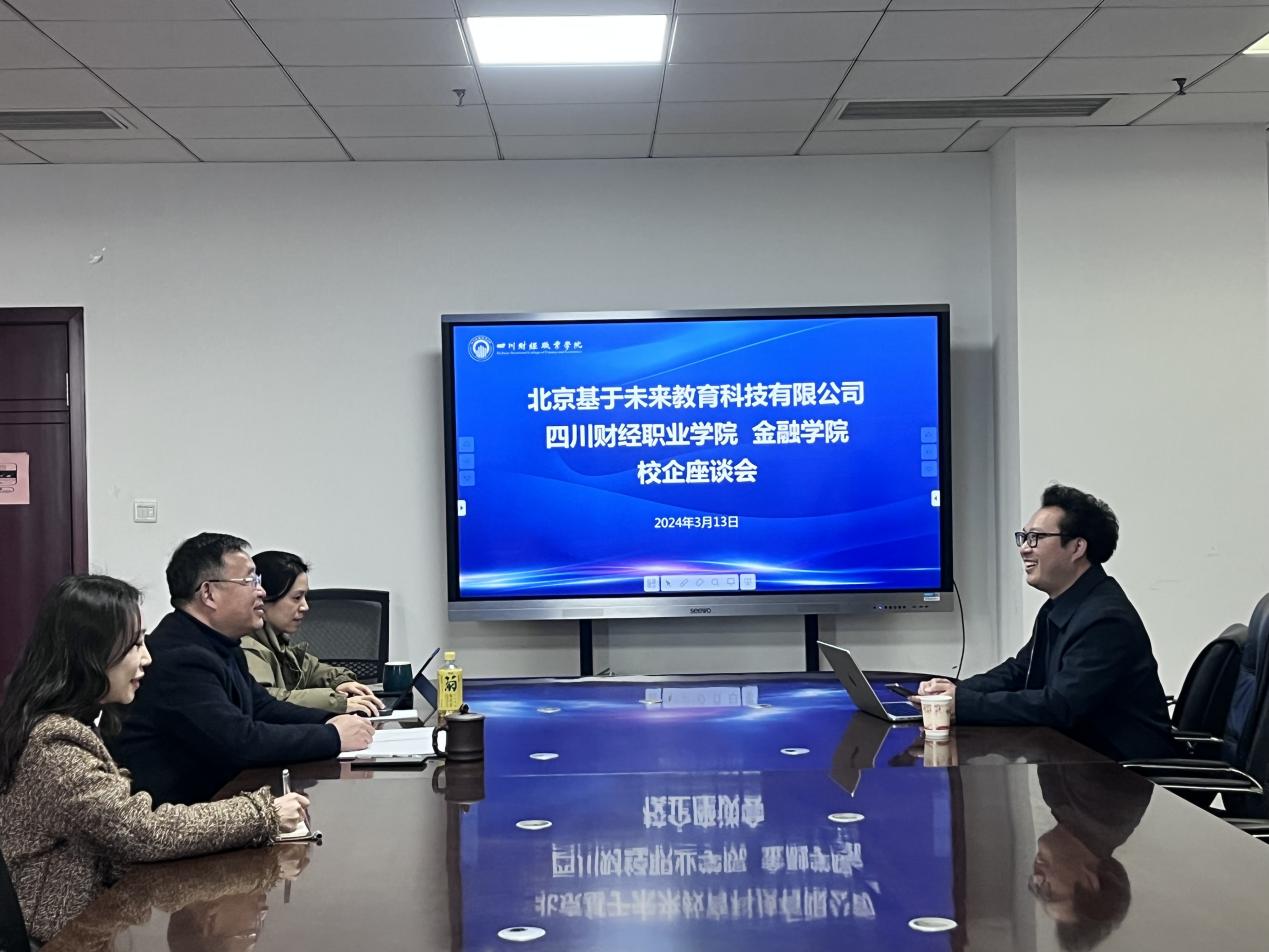 2024年3月13日下午,金融学院院长叶剑明、副院长李琳等在明德楼712会议室与北京基于未来科技有限公司总经理王元波举行了校企合作座谈,双方就深化产教融合、校企协同育人等议题进行了交流。
