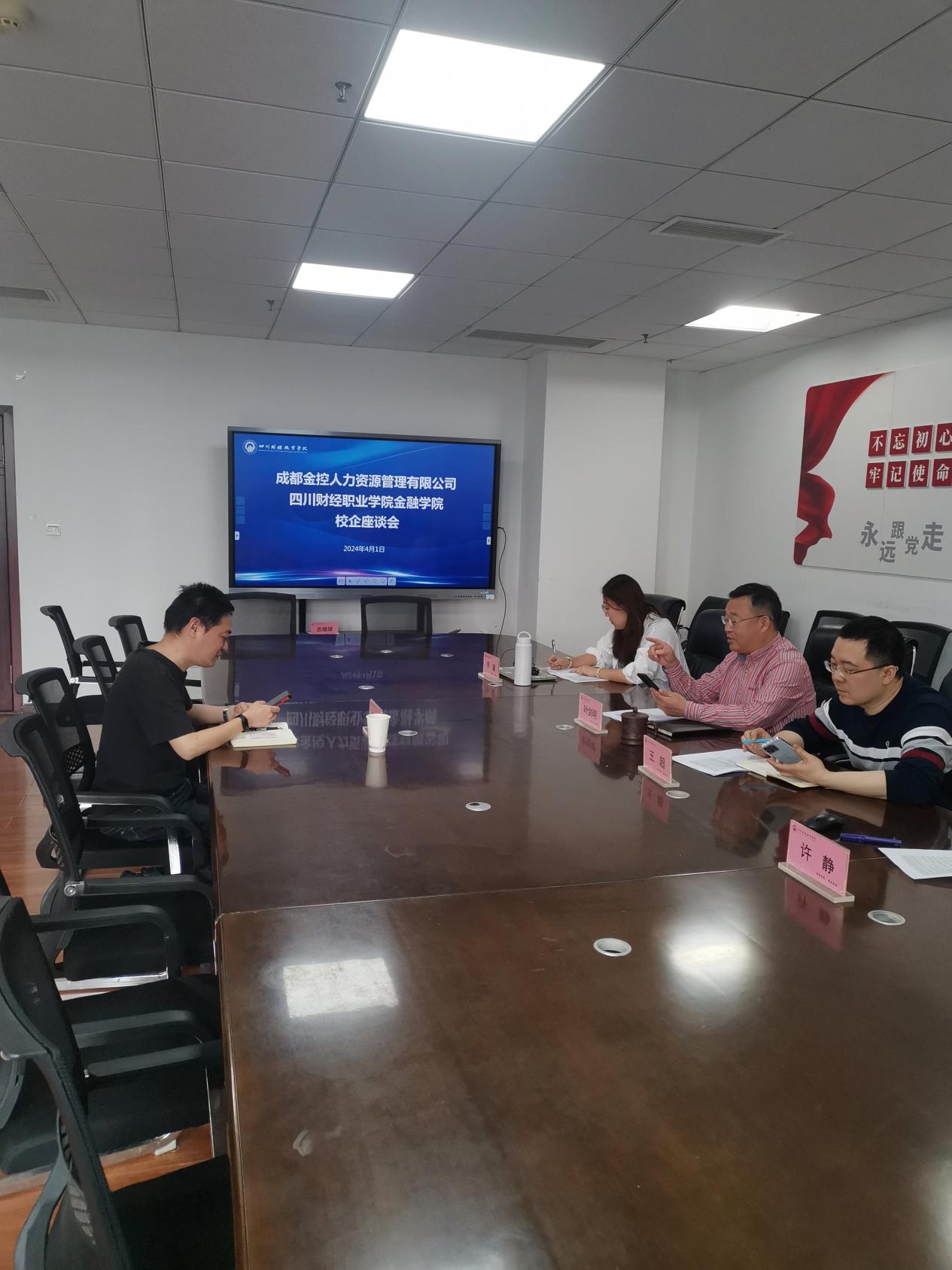 2024年4月1日,金融学院与成都金控人力资源管理有限公司进行了校企洽谈,金控人力资源管理有限公司赵旭经理、金融学院党总支书记、院长叶剑明、金融管理教研室主任王超、金融科技应用教研室李馨、金融学院办公室主任许静参加了此次座谈。