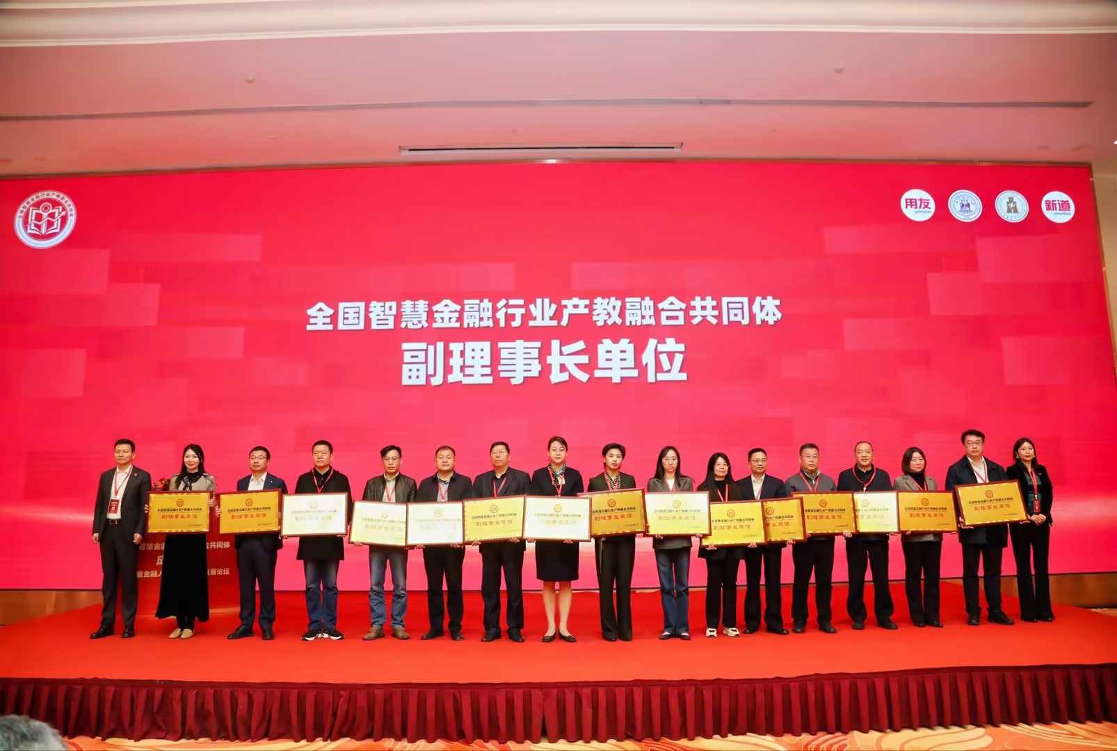 会上,举行了隆重的全国智慧金融行业产教融合共同体成立仪式。根据共同体章程,全国智慧金融行业产教融合共同体理事长单位为用友金融信息技术股份有限公司、上海财经大学、新道科技股份有限公司、长春金融高等专科学校,推选的副理事长单位授牌。