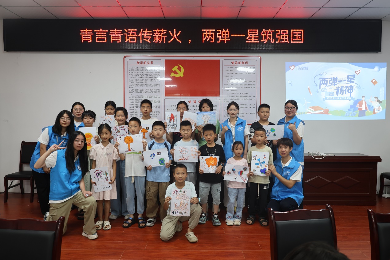 随后,实践团成员刘卓颜为小朋友们系统讲解了“两弹一星”的基本知识,生动讲述“两弹一星”事业从无到有、从弱到强的艰辛历程。让小朋友们学习到了先辈们为了国家利益,舍小家为大家,不惧艰难险阻、勇攀科学高峰的崇高品格。知识宣讲结束后,实践团协助刘卓颜还带领小朋友们开展了“两弹一星”绘画课堂活动。绘画课堂上,小朋友们充分发挥想象力,用手中的画笔描绘出了自己心中的“两弹一星”,用自己手中的画笔向“两弹一星”精神致敬,也让“两弹一星精神”在他们心中生根发芽。