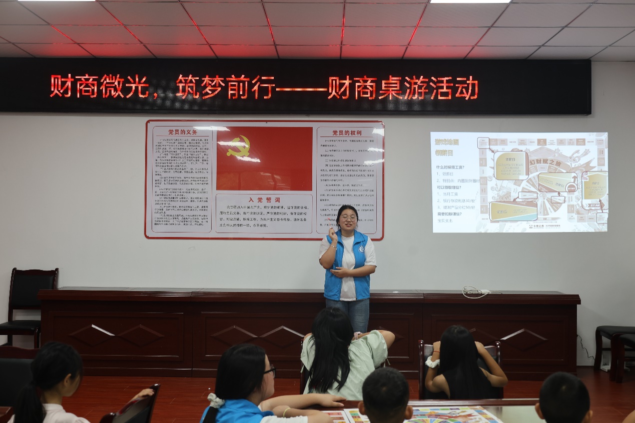 下午,“财商微光 筑梦前行”儿童财商桌游活动顺利开展。活动伊始,实践团成员周诗雨以“松鼠皮皮开水果店”趣味故事为引,引导小朋友们积极参与讨论,激发孩子们对财富管理的兴趣。随后又为现场小朋友详细拆解“奇幻财赋之旅”桌游规则。这款桌游设置丰富场景,搭配“金融大本营”“市场风云”“宝贝计划”等特色卡牌,分别对应财富规划、风险应对、长期目标管理等经济生活场景,借游戏模拟真实情境,诠释财富配置原理与人生规划思维。讲解中,小朋友们专注聆听,主动提问,在互动里深化对规则的理解。