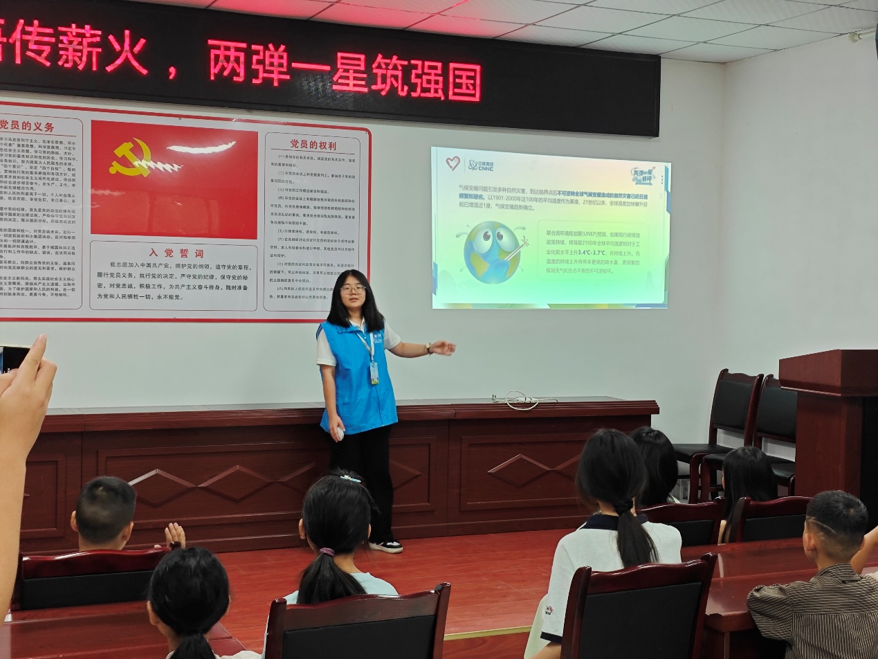 活动开始,实践团成员李静以“核力碳达峰,助力碳中和”为主题,为小朋友们分享碳中和知识。她生动详实地讲解了核能在推动碳达峰、实现碳中和目标进程中的重要作用,将前沿的环保理念与“两弹一星精神”中勇于创新、开拓进取的内核相结合,展现了“两弹一星精神”在新时代的传承与发展。
