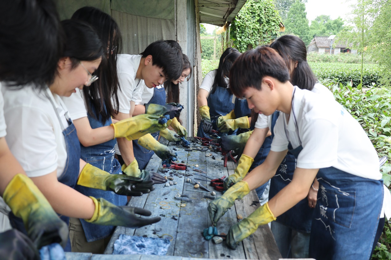 随后,实践团又走进明月村一家扎染坊,开展非遗扎染体验活动,感受传统手工艺的独特魅力。一块块白布在同学们手里,经过浸湿、捆扎、浸染、清洗、晾晒等步骤后,变成了一幅幅色彩绚丽、图案独特的扎染作品。