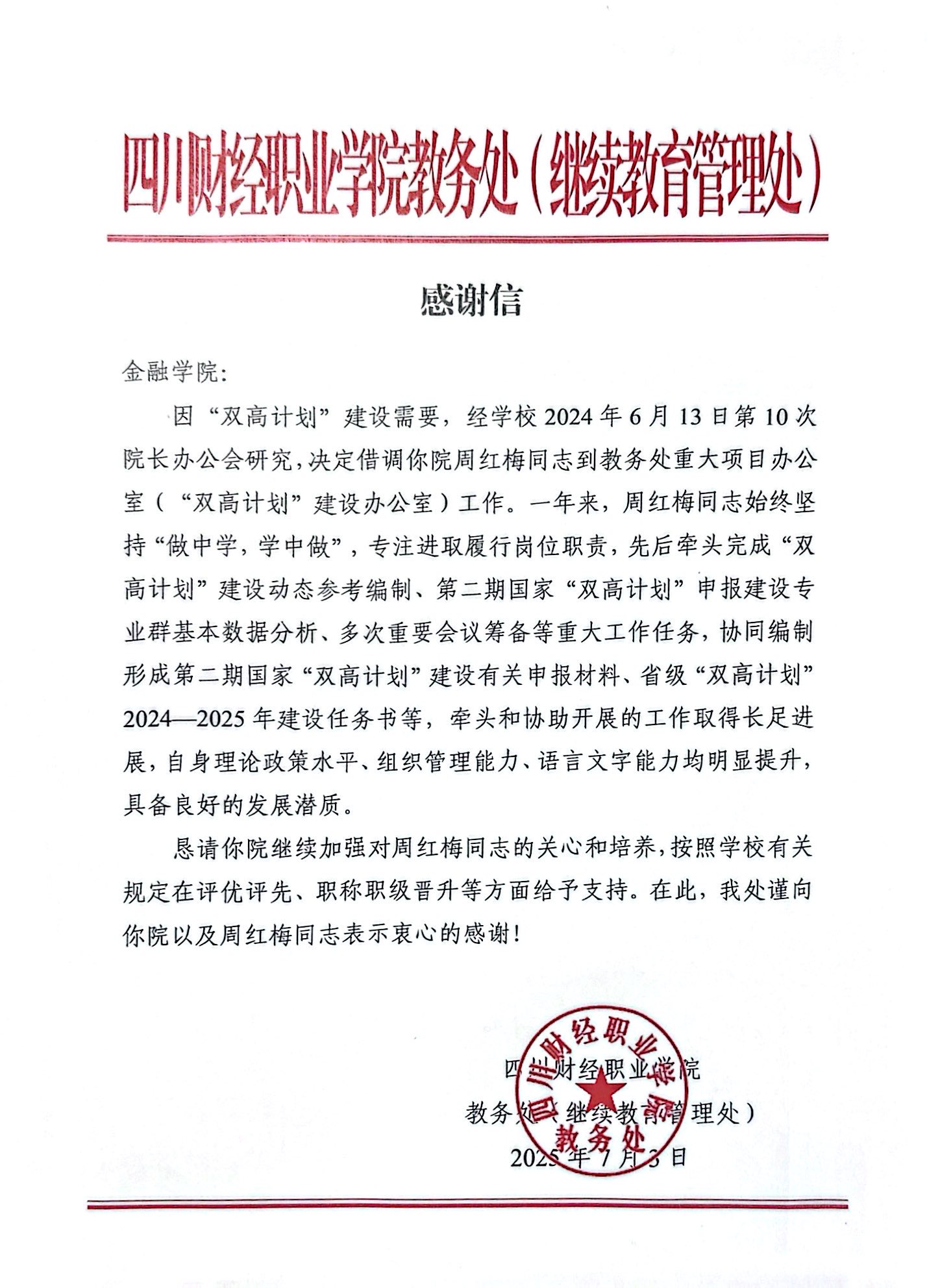 2025年7月3日,金融学院收到了来自7790cnm必发集团教务处的感谢信,信中对周红梅同志在借调教务处重大项目办公室(“双高计划”建设办公室)期间突出的工作表现给予充分肯定。