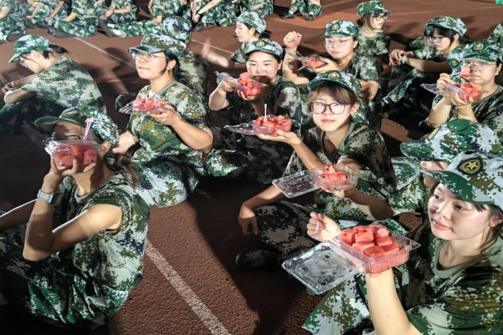 为表达对新生连日刻苦训练的慰问与关怀,训练间隙,李玲老师来到训练场地,和新生辅导员助理团队一同为新生们送来清甜可口的西瓜和清凉解渴的水。一块块鲜红多汁的西瓜递到新生手中,不仅为他们带来了夏日的清凉,更传递了辅导员老师和学长学姐的关怀与鼓励。新生们吃着甘甜的西瓜,脸上洋溢着幸福的笑容,训练的疲惫在这一刻得到了缓解。这份夏日中的深切关怀,是学院“以人为本”育人理念的生动体现。点滴温暖举措,切实提升了新生们的获得感与幸福感,进一步凝聚了团队向心力,为军训工作的顺利开展注入了持续动力。