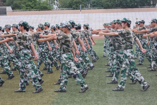 训练场上,炙热的阳光照射着每一个挺拔的身影。新生们身着迷彩服装,目光坚毅,在教官的指令下全力以赴地完成每一个动作。站军姿、齐步走、正步走……汗水浸透了衣衫,但同学们依然保持着标准的军姿,力求动作整齐划一。他们用坚毅的眼神、挺拔的身姿,诠释着"不怕苦、不怕累"的军训精神,在重复练习中磨练意志,在团队协作中凝聚力量。