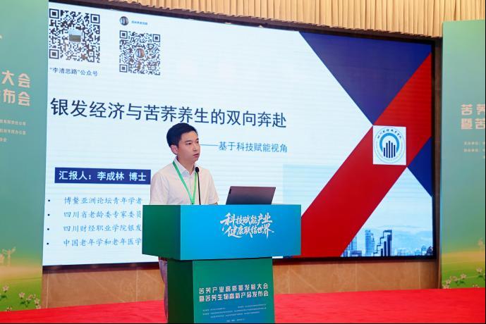 2025年9月21日,由四川省乡村发展联合会主办的“苦荞产业高质量发展大会暨苦荞生物高新产品发布会”在成都金牛宾馆隆重举行。我院银发经济与养老金融研究中心副主任李成林博士受邀出席,并作《科技赋能:苦荞产业与银发经济的融合创新》的主题演讲,从人口老龄化趋势、银发经济政策导向与健康产业发展机遇等多维度,深入阐释苦荞产业在老年营养、慢病管理及日常保健领域的广阔前景。