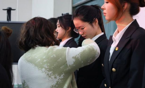 接着,徐言、蒲晓玲、石羽可及王晨怡老师为新团员代表佩戴了闪耀的团徽并颁发了团员证,这不仅是身份的象征,更是一份光荣与责任。现场响起热烈掌声,向新团员们表示衷心祝贺。