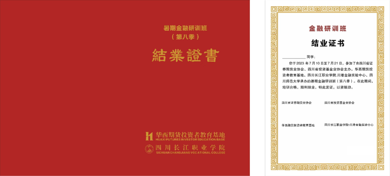 每位学员按照要求完成全部课程并通过相关考核后,获得由四川省证券期货业协会、四川省投资基金业协会、华西期货投资者教育基地、四川长江职业学院.川港金融实验中心联合用印的暑期金融研训班结业证书。