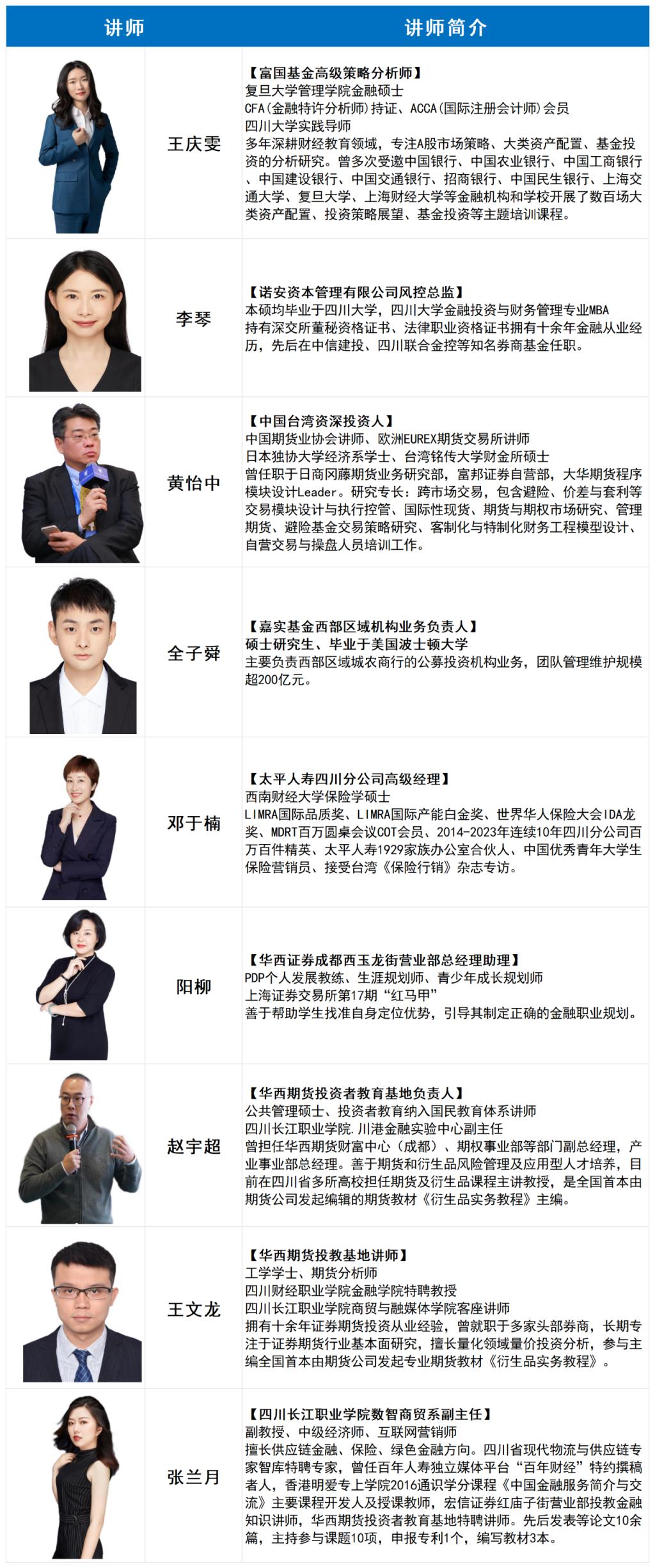 暑期金融研训班课程覆盖银行、保险、证券、基金、期货等金融行业,课程注重从金融理论、实践运用、实训实操、团队协同、品德培养等角度出发,以培养应用型金融人才为目标,注重理论与实践结合,帮助在校大学生深入了解前沿金融资讯,帮助其精准定位职业生涯。暑期班开办至今已累计服务来自香港大学、香港理工大学、四川大学、电子科技大学、西南财经大学、四川师范大学、西安欧亚学院、云南财经大学等二十余所知名高校学子。