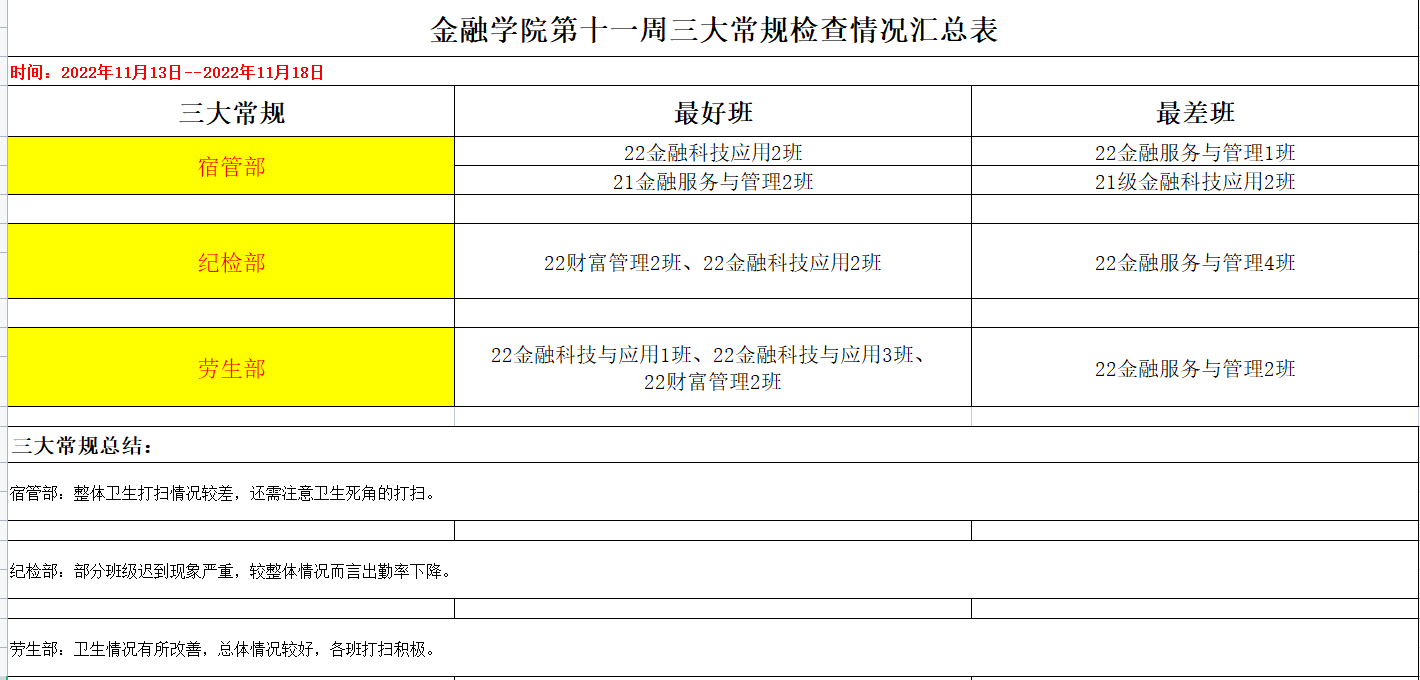 金融学院在日常生活中对每个班级进行这三项检查,可以有针对性的进行诊改,可以保障金融学院学生能在一个优美,洁净的环境中愉快地学习,健康地生活,增强学生爱护校园环境的意识。