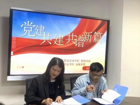 会议最后,成都航院管理学院党总支与金融学院党总支开展党建工作交流,并签订党建共建协议书。共建活动为共建双方提供了相互学习、相互借鉴、共同发展的党建发展平台,为双方党建注入活力,通过党建结对塑造灵魂,通过党建与专业融合培育新人,促进了两校、两院、两总支合作进一步走深走实。
