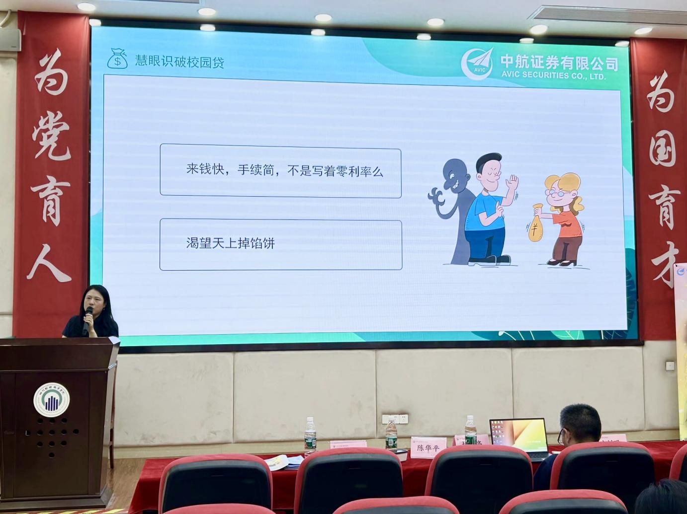 活动现场,中航证券四川分公司合规总监王建玲老师通过生动的案例讲解、详细的知识解读,向同学们由深入浅出地介绍了非法证券活动的常见形式和特征,如虚假荐股、非法集资等。提醒同学们在面对各种看似诱人的投资机会时要保持高度警惕,不要轻易相信陌生人的高额回报承诺。
