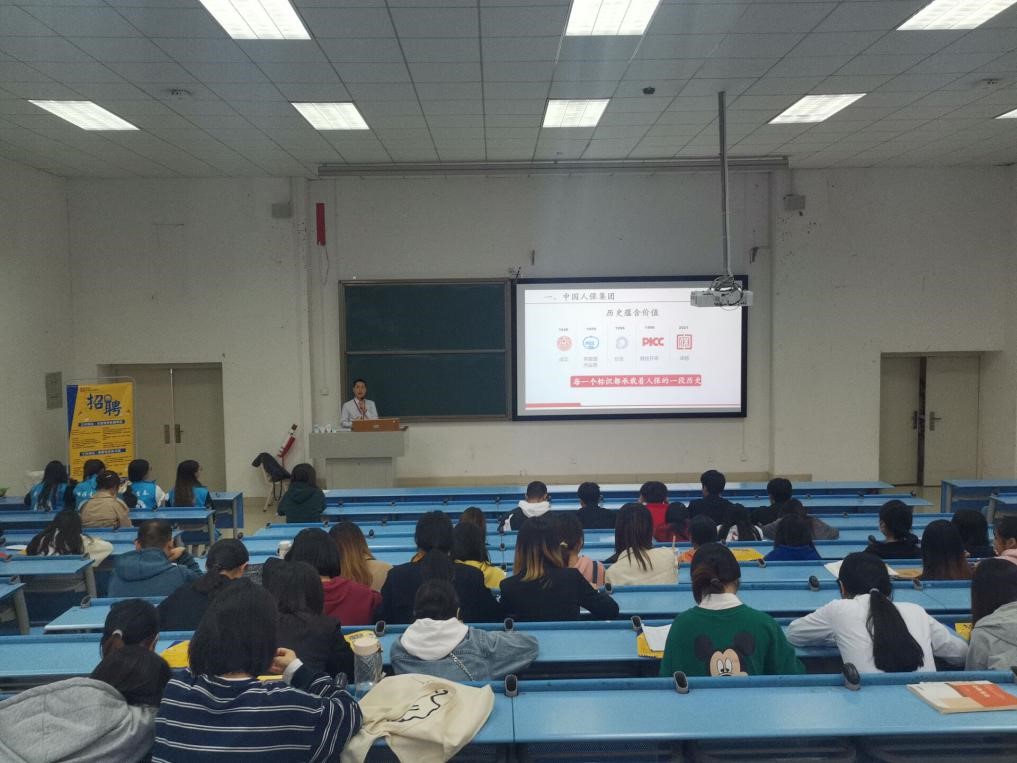 宣讲中,人保财险成都续务部李欣老师向大家介绍了中国人保集团的基本概况,通过不同阶段的标识反映人保的历史底蕴,同时向大家传递了“人民保险,服务人民”的企业使命以及做人民信赖的卓越品牌的企业愿景。随后,李欣老师就当下保险行业的发展前景,如何进一步提升本行业人才素质作了简要介绍,为今后毕业生的就业发展等问题与同学们进行了深入的交流与探讨。张延昕老师表示,金融学院的专业设置及教学工作对本行业具有较强的适应性,我院毕业生在相关专业发展方面优势较为突出,能更好地服务于企业与社会经济的向前发展。