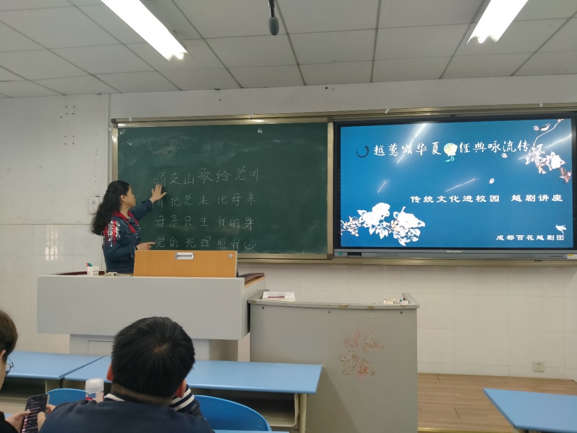 讲座进行中,老师对同学们进行简单的越剧历史讲解后,告诉同学们组织一支越剧表演队排练越剧节目并将于下个月在学院进行表演。表演内容选定为越剧歌曲“唱支山歌给党听”并在现场进行了歌曲内容一小段的现场教学,同学们都学习的非常认真。