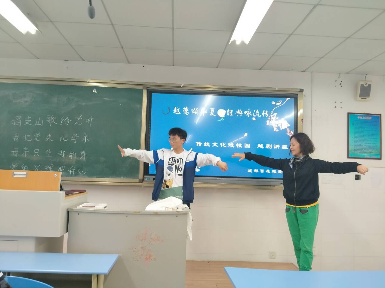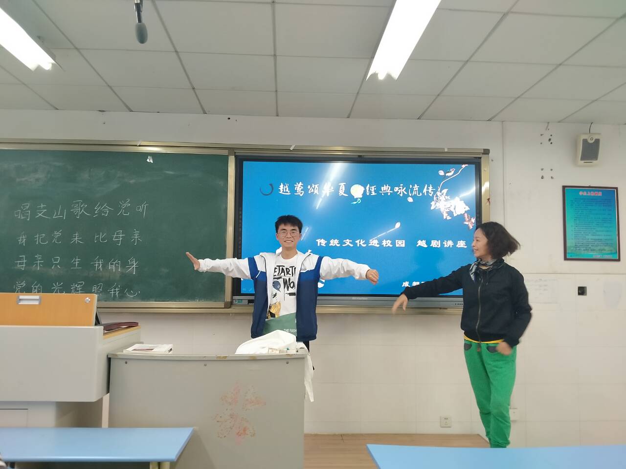 老师对同学们进行了耐心的教学,教同学们每个字的发音和升降,带着同学们合音乐。悠扬婉转的越剧歌声在教室里回响,老师对同学们的学习表现给予了肯定。并希望同学们将越剧文化带入班级,希望同学们可以积极加入接下来老师组织的越剧合唱团,并且老师们还会在下周到学校给我们展示一场越剧表演。