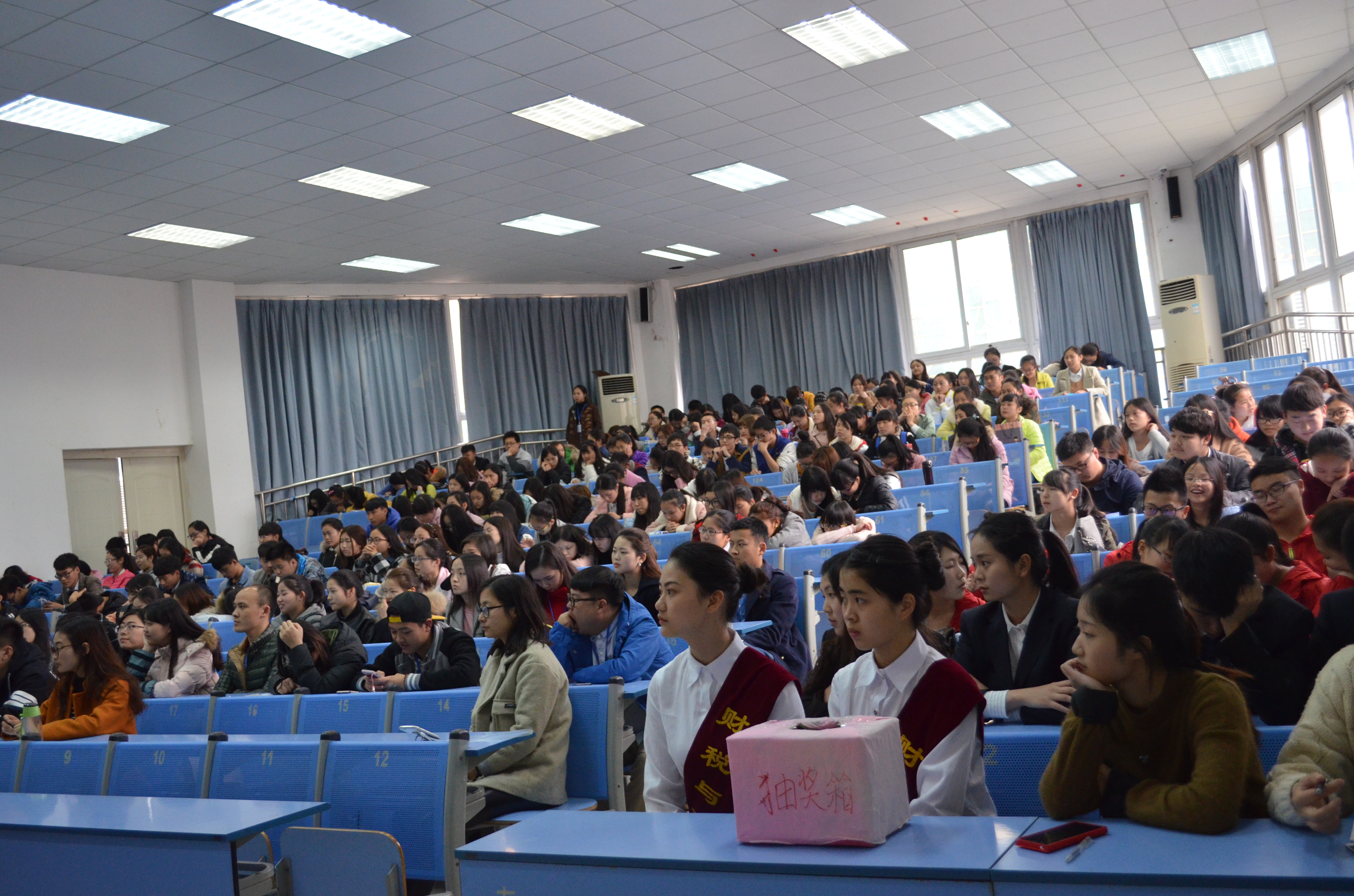 最后,在朗诵之后我们又进入了抽奖环节,并在轻松的氛围中公布了本次比赛的名次。15级税务二班的参赛队伍凭借这默契的配合以及精彩的朗诵荣获了冠军。