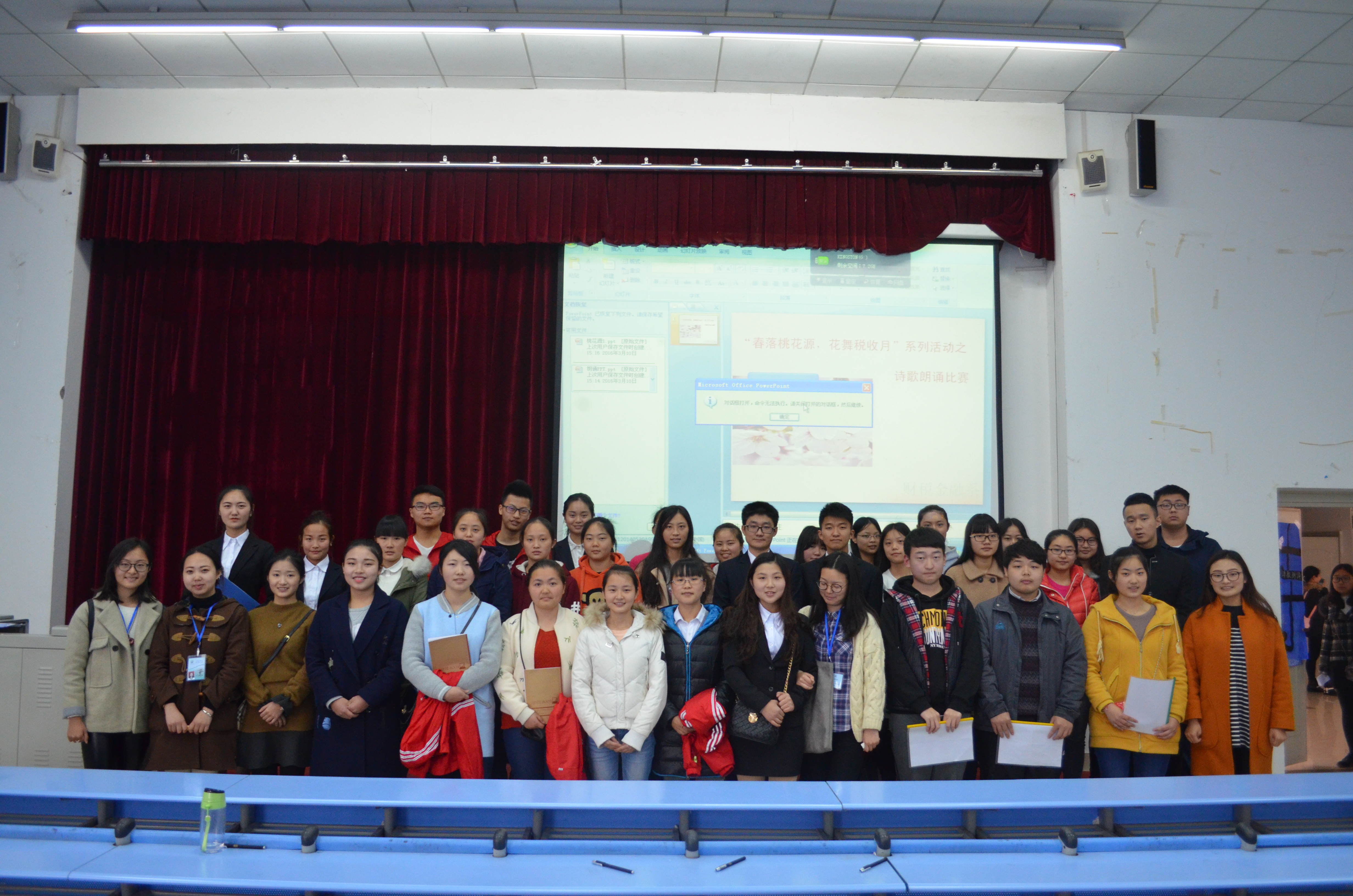 2016年3月10日下午2点,财税经融系在B213教室举行了“春落财院,花舞岁月”系列活动之诗歌朗诵比赛。出席本次活动的有院团委秘书长杨义炜,广播站站长张晓,系团总支副书记杨雪,上届诗朗歌诵冠军钟威以及财税金融系15级全体同学们。