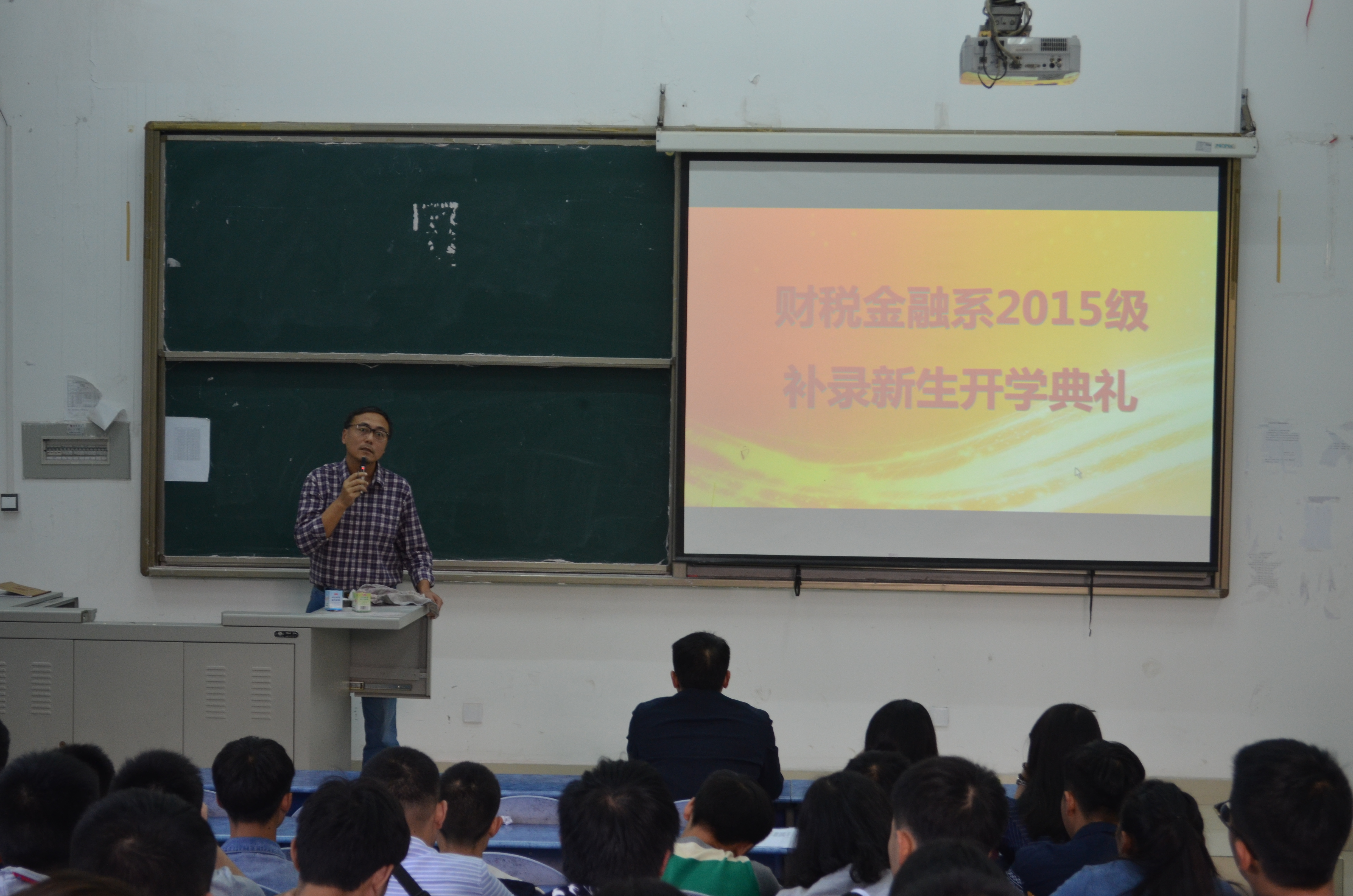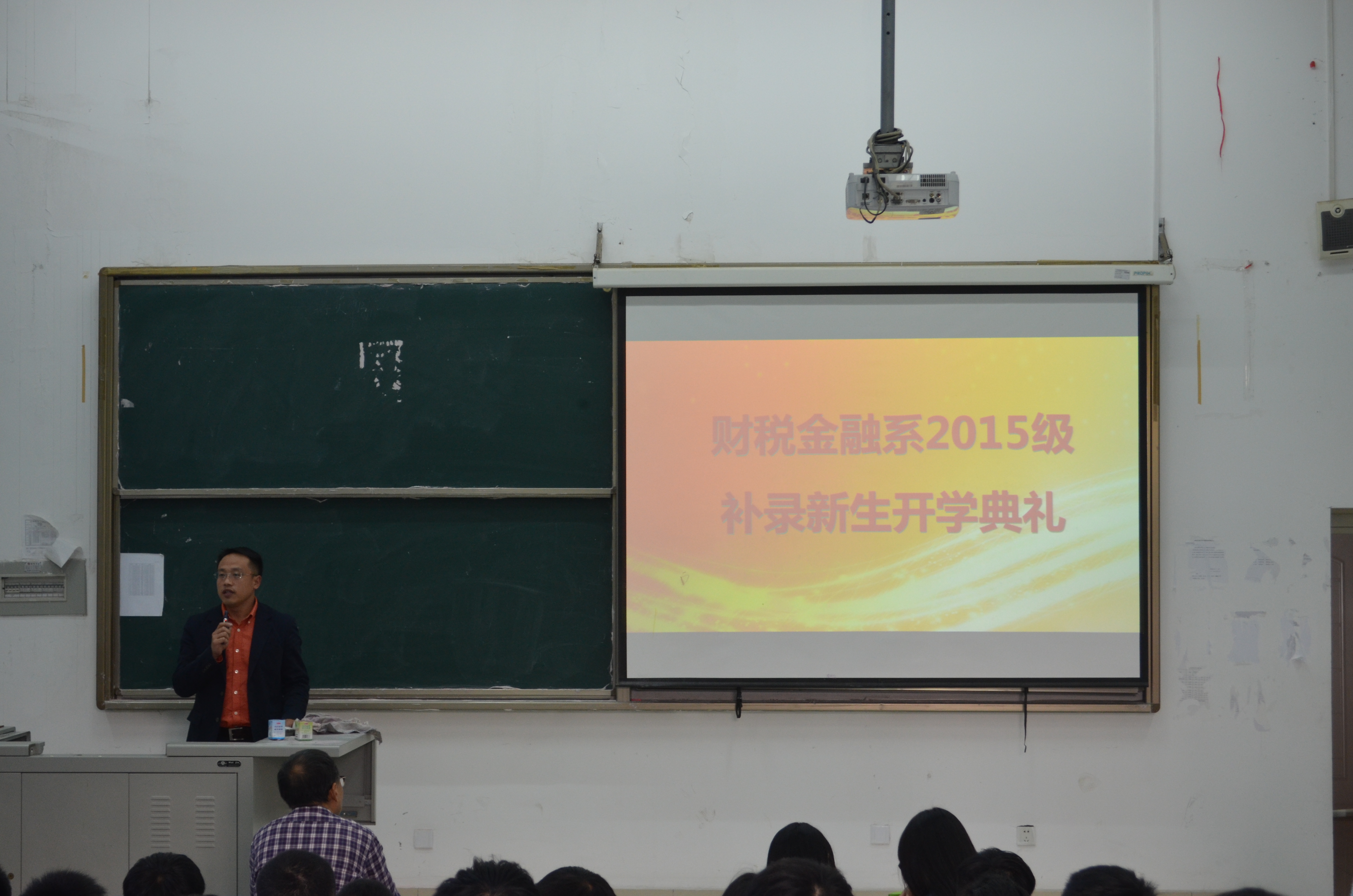 2015年10月10日,下午3点30分财税金融系于B210教室开展了2015级补录新生开学典礼。在典礼开始之前,纪检部提前到场点到,组织学生进场。本次开学典礼在优美的歌曲与热烈欢快的气氛中展开。