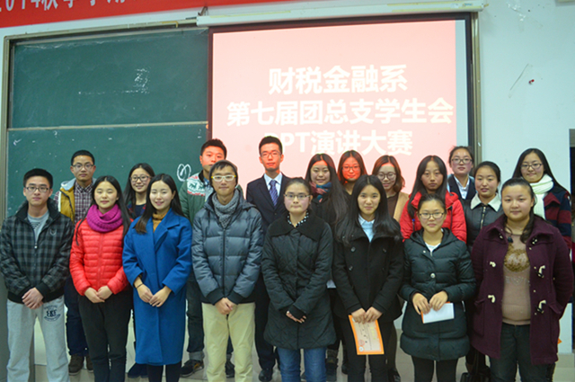 2014年12月23日 在B108举行了财税金融系第七届团总支学生会PPT演讲大赛。到场的评委及点评嘉宾有:院学生会副主席,会计一系学生会主席、会计二系学生会主席,工商管理系学生会主席、院团委办公室部长,财税金融系学生会主席熊思远、副主席曹栌予,唐良海、及各部门部长。