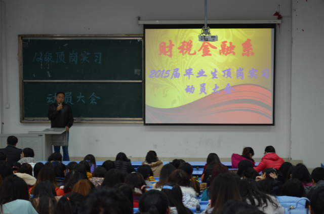 2014年11月24日下午一点整,财税金融系在B112教室举行了针对2012级全体同学顶岗实习的动员大会。参加本次会议的有财税金融系系主任钟用同志,财税金融系党支部书记祝刚同志,以及财税金融系学生党支部书记李虹同志和2012级全体同学。