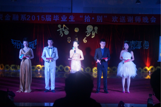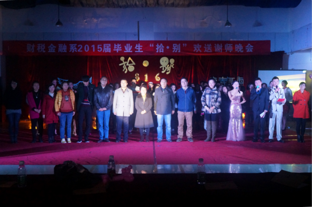 2014年11月25日晚七点整,由财税金融系精心筹划的2015届毕业生“拾·别”欢送谢师晚会在食堂三楼拉开了帷幕。参加这次晚会的有我院党委副书记、副院长黄吉秀同志,院团委书记刘丹同志,以及我系系主任钟用同志,我系党支部书记祝刚同志,思政部副主任李如万同志,我系学生党支部书记李虹同志,我系各班辅导员和法律教研室老师,以及我系12级、14级全体同学。