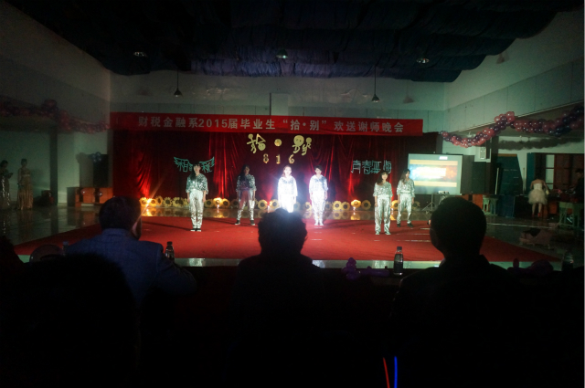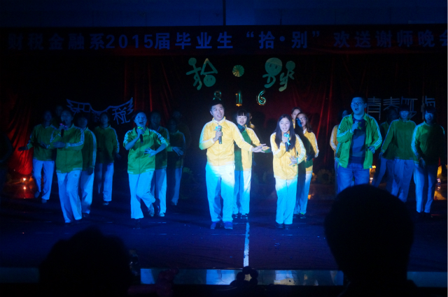 然后,由我系12、13、14级的同学派出的五位男生代表合唱了一首《外面的世界》。“外面的世界很精彩,外面的世界很无奈。”五个大男生用饱含感情的歌声唱出了对大三学长学姐们的祝福。