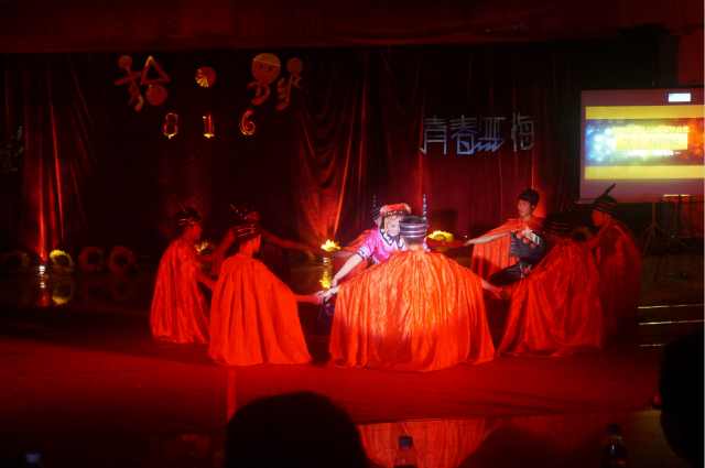 紧接着,由我系14级新生表演了民族舞蹈《花溪花溪》。在优美的旋律,动人的舞姿当中,第一篇章“青涩时光”画上了句号。