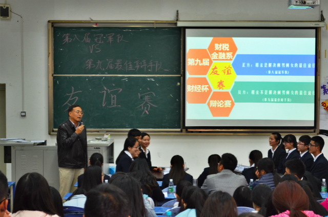 2014年11月6日下午1点20分,财税金融系“财经杯”第九届辩论赛友谊赛在B210正式拉开帷幕。我们有幸邀请到了财税金融系党支部书记祝刚同志,财税金融系学生党支部书记李虹同志,13、14级的两位专职辅导员以及我系学生会主席到场作为点评嘉宾。