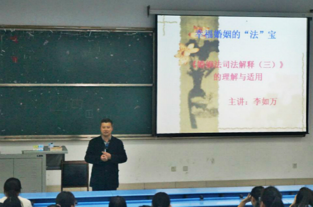 讲座在同学们热烈的掌声中拉开了帷幕。首先,李老师从专业的法律角度向同学们阐述了婚姻法司法解释(三)的法律意义,并针对财产分割、子女抚养问题等与婚姻息息相关的法律常识做了重点讲解,让在座的同学获益良多,也深深的了解了学习婚姻法对维持幸福的婚姻的重要性。