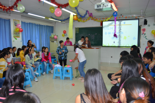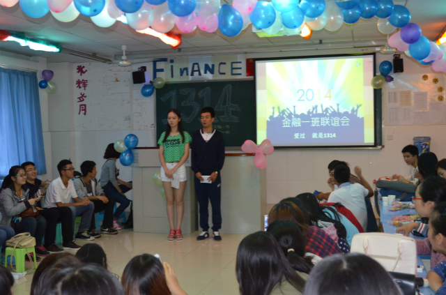 更值得一提的是14级各班对联谊会现场的布置。他们用各种可以利用的装饰迅速的将平时严肃的教室布置成了欢乐的活动现场,各种气球、彩带、剪贴画将教室装点成了一片温馨的海洋。
