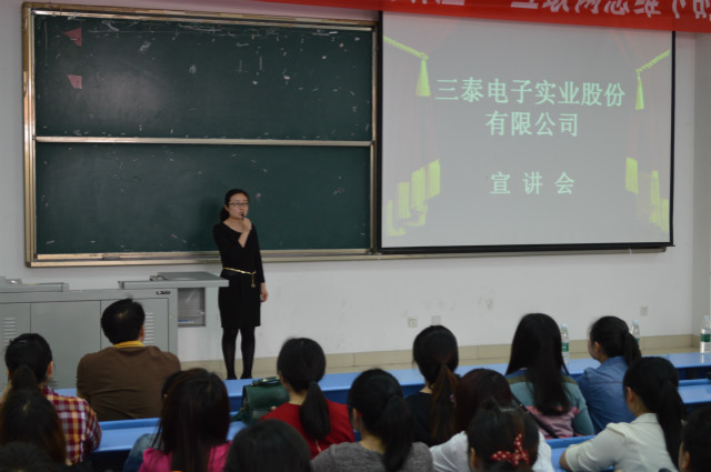 接着,由三泰电子西南大区招聘主管李琴女士发言。她向同学们详细介绍了三泰电子实业股份有限公司的发展历程,讲述了三泰电子实业股份公司的企业精神与理念,并向同学们展示了三泰电子的宣传视频。同学们聚精会神的观看,仔细的聆听讲解,对三泰电子公司的情况有了进一步的了解。、