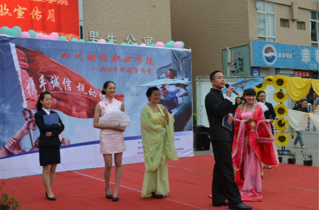 下一项活动,是由我系主办的桃花源活动中推选出来税收宣传大使,“桃宝”们的精彩表演。我们的宣传大使“桃宝”们以走秀的形式展示了中国历史变迁,寓示着税收在中国历史舞台上的形象。在表演的最后,主持人向现场的观众们提问了关于税收的各项知识,并赠送了精美礼品,将现场的气氛推向了高潮。