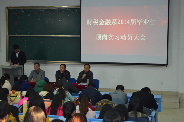 2013年12月3日下午2点,我系在B212举行了“财税金融系2014届毕业生顶岗实习动员大会”。到场的领导有我系主任钟用,系党支部书记祝刚,系副主任李如万,系学生党支部书记李虹以及11级全体辅导员。