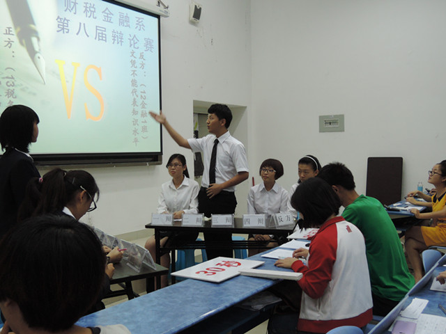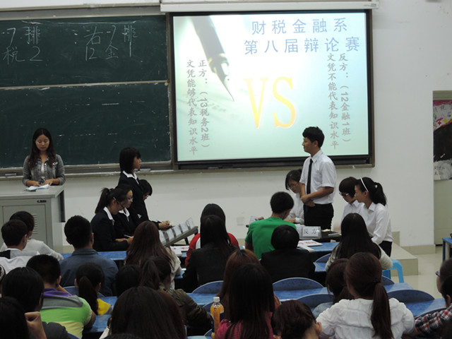10月10日晚上7点30我系第八届辩论赛的第二轮比赛于B110教室激烈展开。担任本次比赛的评委有院学生会主席周雯玉、财税金融系学生会主席李雪等。本场辩论赛的主题是:文凭能否代表知识水平。参赛双方分别是(正方)13级税务二班和(反方)12级金融一班。正方观点为:文凭能代表知识水平;反方观点为:文凭不能代表知识水平。本场比赛赛最终以反方的胜利结束。