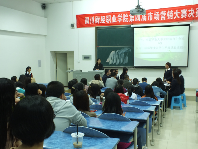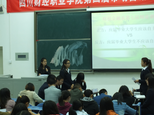 两班的辩手们一进场个个信心十足,势必要赢得比赛,比赛正式开始,正反以“应届毕业大学生是否应该自主创业”为题展开了激烈的辩论,各班的辩手们极力配合,他们慷慨激昂,妙语连珠,将比赛带入一个又一个的高潮,赢得了台下观众的热烈掌声,最终以11级金融三班获胜圆满的结束了这次比赛。