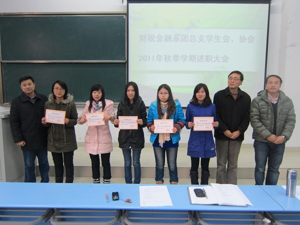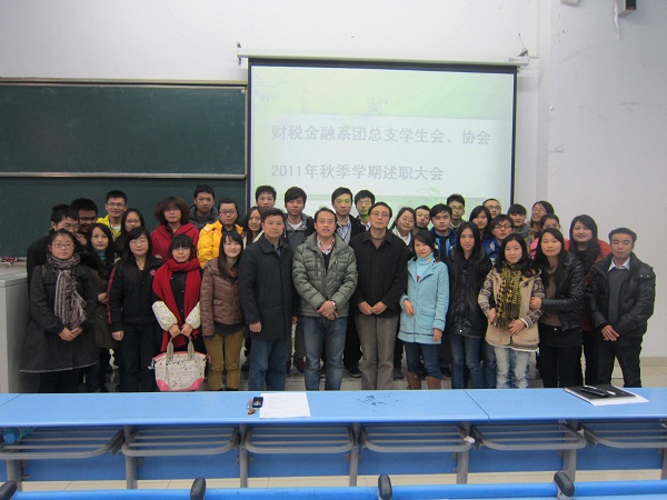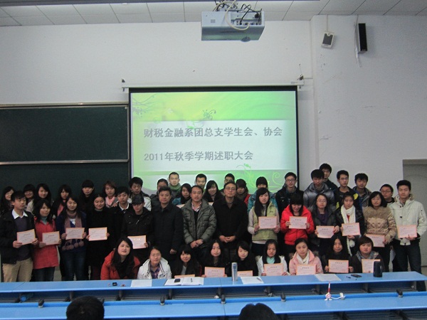 2011年12月26日中午12:30,财税金融系在我院B113教室召开“财税金融系团总支学生会2011年秋季学生会、协会述职大会”。参加此次大会的包括我系各部门的学生会干部、成员、协会代表、各班的班长和团支书。另外还特别邀请了财税金融系主任钟用,副主任李如万,党支部书记祝刚,以及团总支书记李虹。