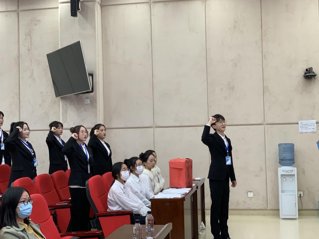 会议最后,新一届学生会干部代表吴怡鑫同学带领各位干部进行宣誓,希望通过庄严的宣誓各位干部能够明确职责,严于律己。
