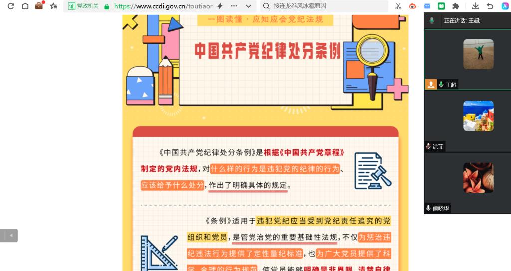 为深入贯彻落实党中央、省委和省委教育工委、财政厅党组关于党纪学习教育的部署要求,全力推进学院党纪学院教育走深走实,加强党员的党性教育,提高党员遵纪守法的自觉性,金融科技教研室党支部于2024年4月28日组织全体党员以在线会议方式开展了以《中国共产党纪律处分条例》(以下简称《条例》)专题学习。会议由支部纪检委员侯晓华主持,全体支部党员参加此次学习。