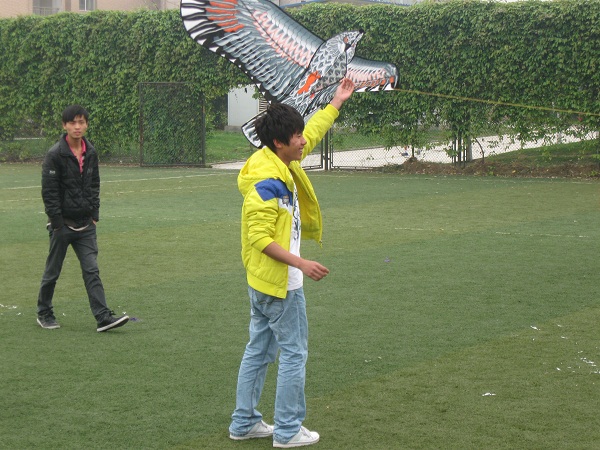 下午四时,众多同学带着他们各式各样的风筝来到足球场上准备上演一场风筝的“盛宴”。当比赛正式开始时,各评委手持评分细则,有序的站于操场的各个指定点上,而此次评分重点则体现在创意这一方面。天气虽不是晴空万里,却也是适合放风筝的好天气。伴随着和煦的春风,一个个漂亮的风筝攀上蓝天,五彩缤纷的风筝像花朵一样绽放在天空中。此时我们的内心心潮澎湃,完全沉浸于这次活动中。