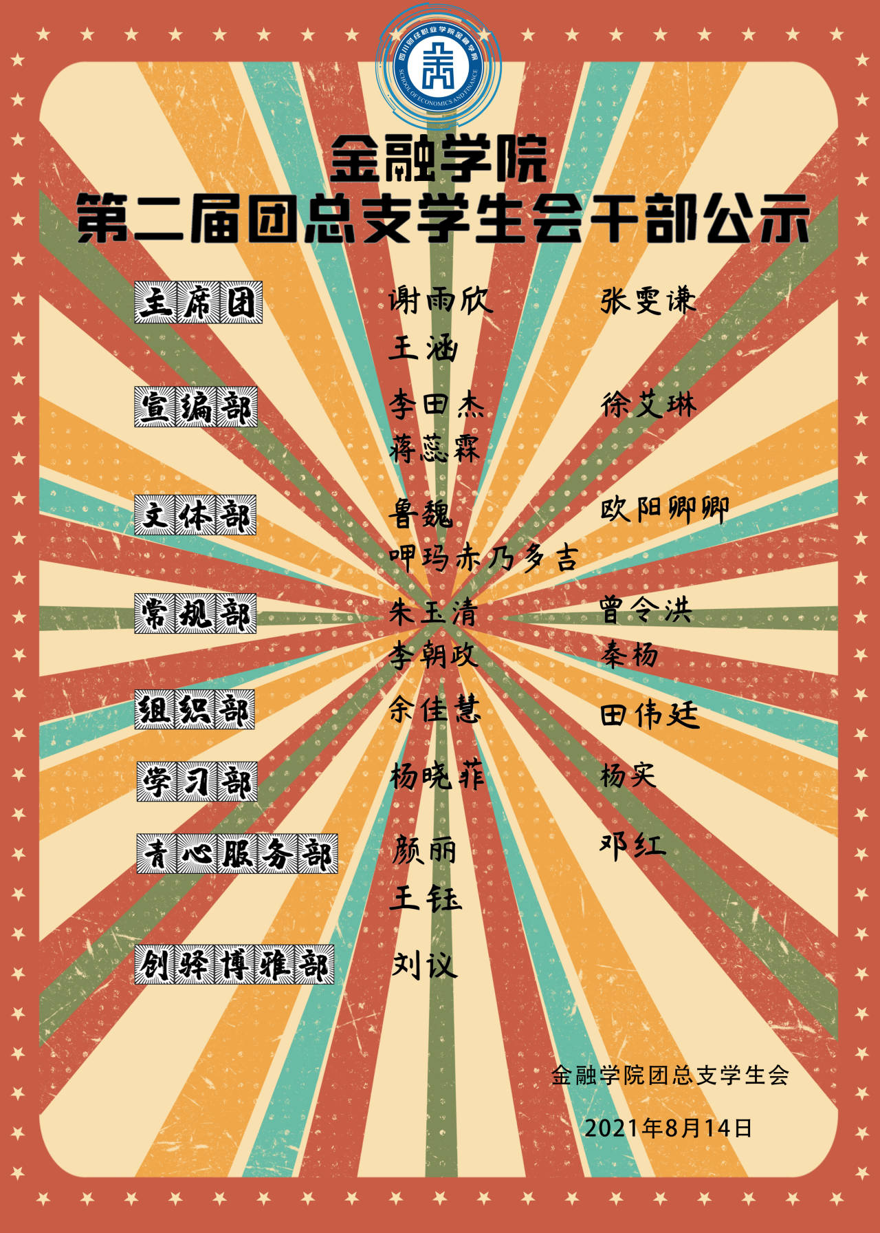 学生会是学校党委领导下、团委指导下的主要学生组织,是学校联系广大学生的桥梁和纽带,是同学们学习交流的共同平台。金融学院团总支学生会以全心全意为同学服务为宗旨,发挥着服务学生的功能,它一般负责组织各项活动,参与学校的部分政务工作和建设。一个集颜值和实力的金融学院第二届团总支学生会出现啦!