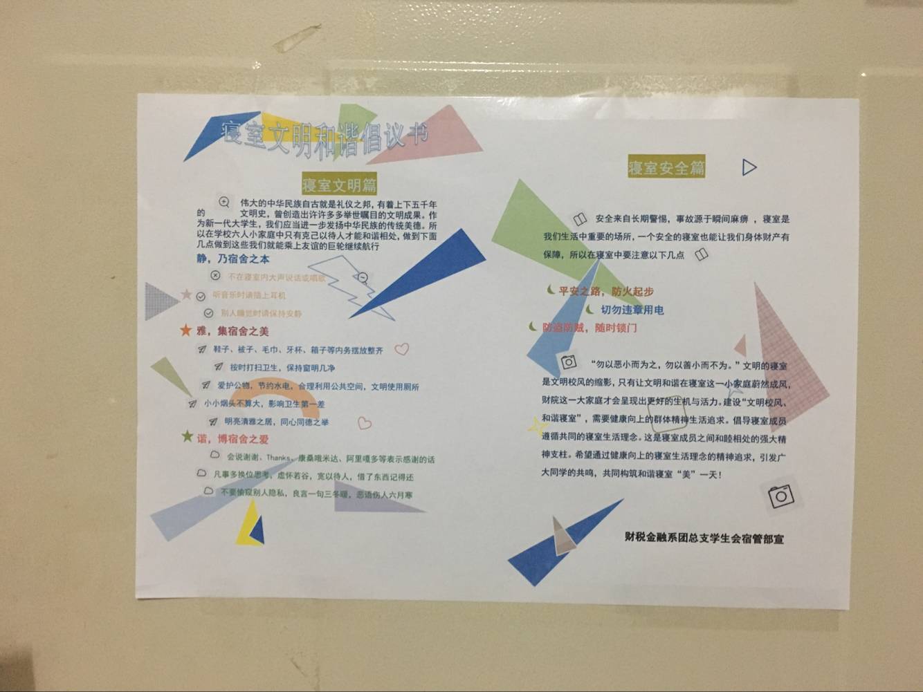 在10月份我系宿管部对全系同学进行了寝室安全与文明知识的宣传,并向每个寝室粘贴安全文明倡议书,加强同学们的安全意识,构建和谐寝室。
