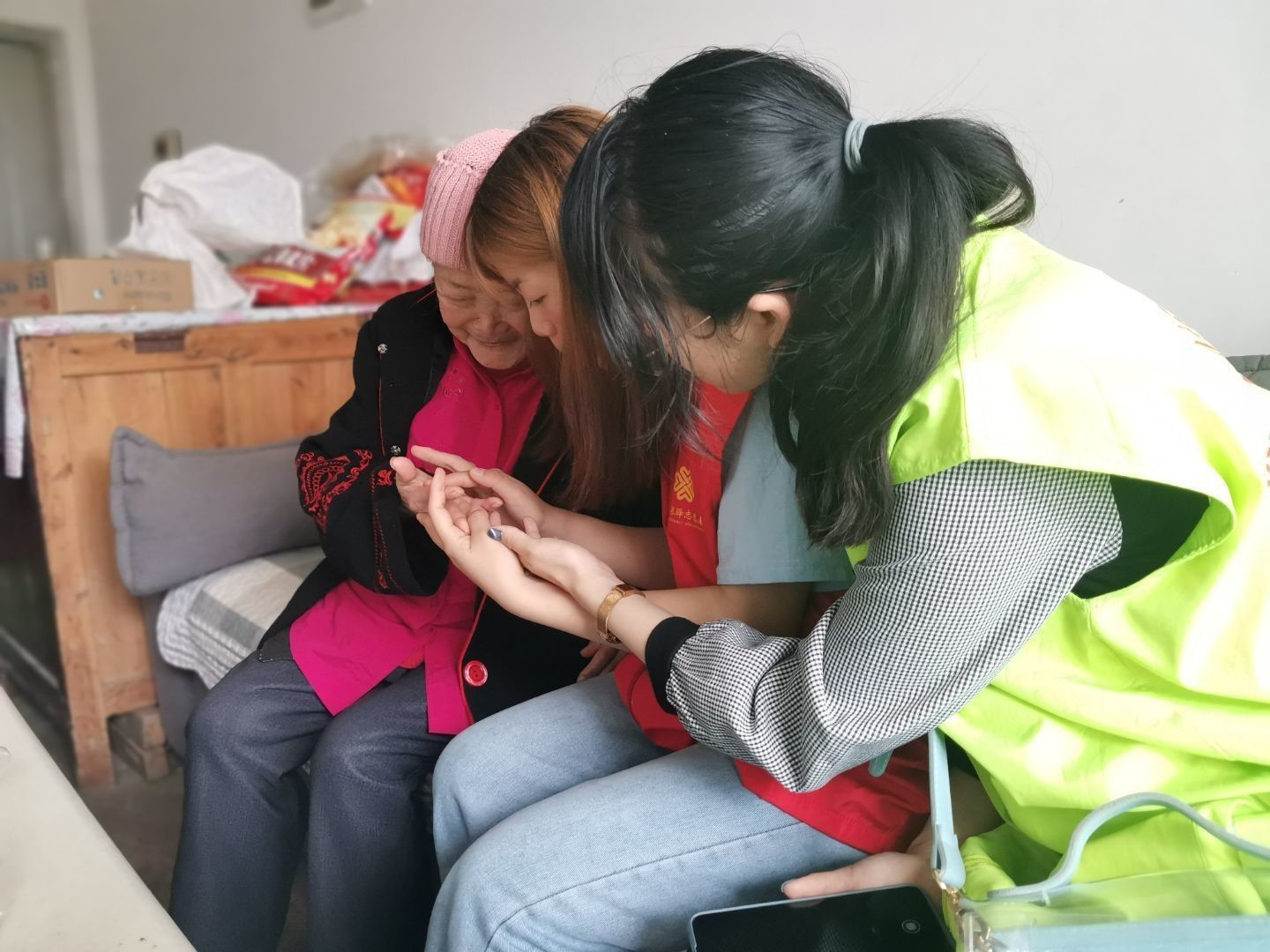 由于常年的身体残疾行动不便,奶奶的脾气有点不太好,但是在大家的“语言攻势”下,奶奶终于露出笑脸啦!