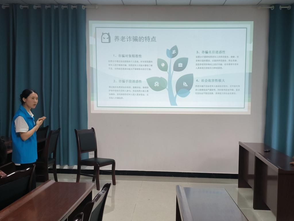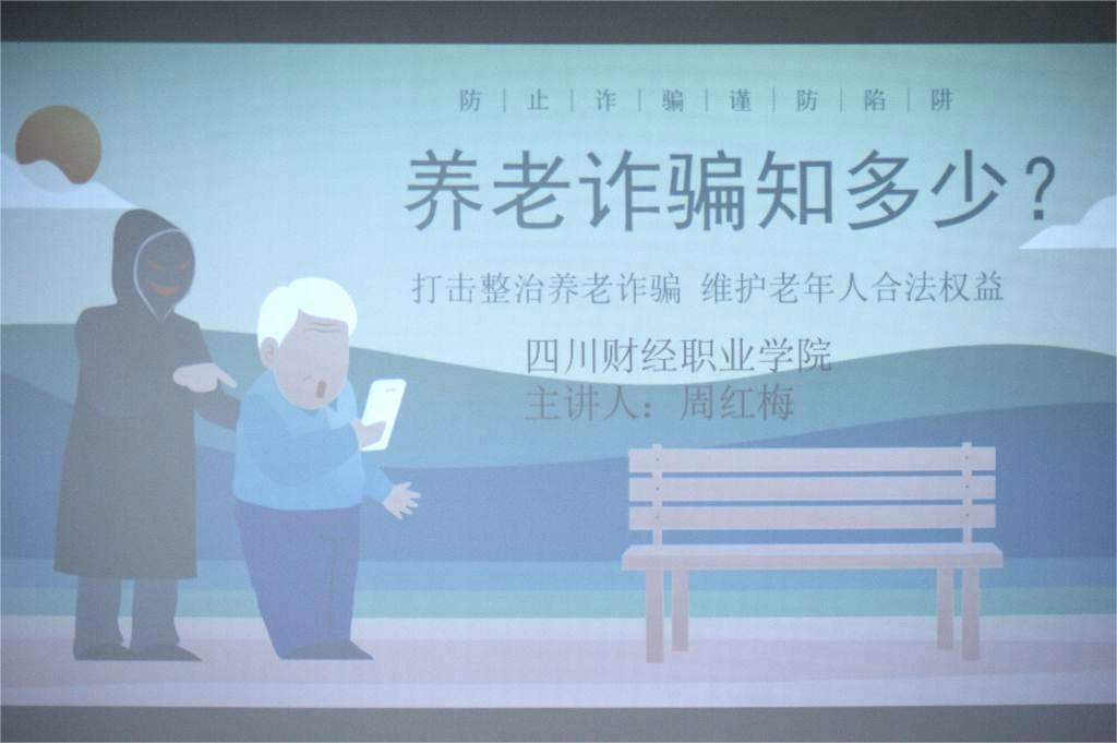 随后,金融学院专任教师周红梅以“打击整治养老诈骗维护老年人合法权益”为主题向社区居民进行了养老诈骗防范知识讲解,通过“理论+案例+互动”的方式,教授大家了解养老诈骗的定义与特点,常见养老诈骗类型,如何预防等,同时还引导社区居民们了解成都反诈官方“熊猫反诈”和下载国家反诈应用“国家反诈App”,帮助居民们在手机上建立起反诈“安全线”。